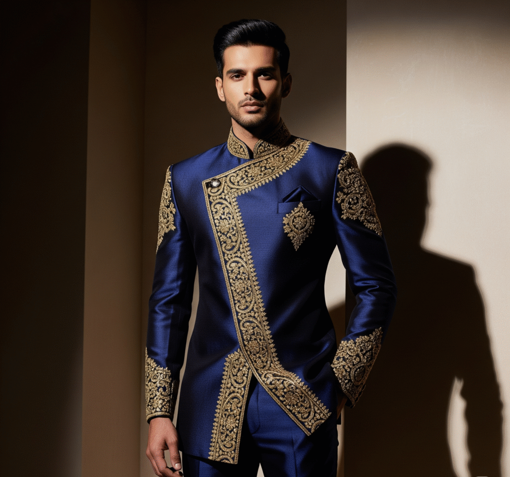 The Indo-Western suit is perfect for those who love blending cultures. Combining the sleek silhouette of a western suit with Indian embroidery or fabric patterns, it’s a great choice for cocktail parties or receptions.