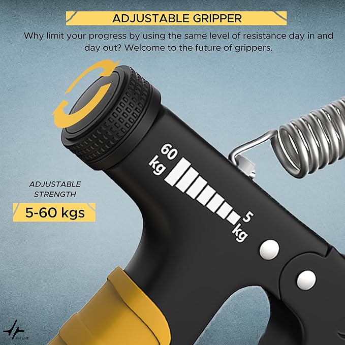 - Adjustable Resistance for Custom Grip Strength Training : The Pulseit hand gripper offers adjustable resistance ranging from 5 to 60 kg, allowing you to tailor your workout to your specific needs. Suitable for athletes, sports enthusiasts, fitness trainers, musicians, and anyone looking to strengthen their hand, wrist, and fingers. Its easy-to-use resistance adjustment makes it ideal for both beginners and experienced users, regardless of gender or strength level.