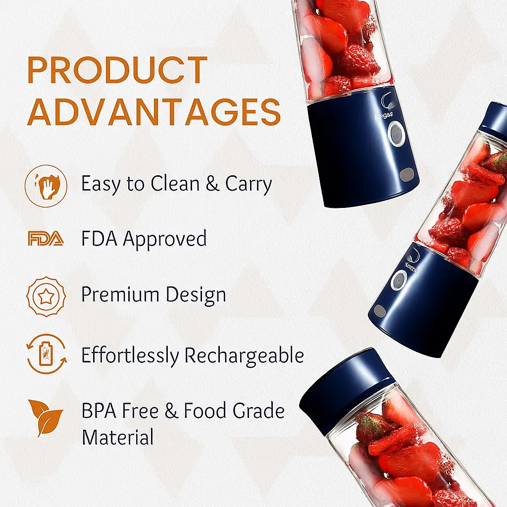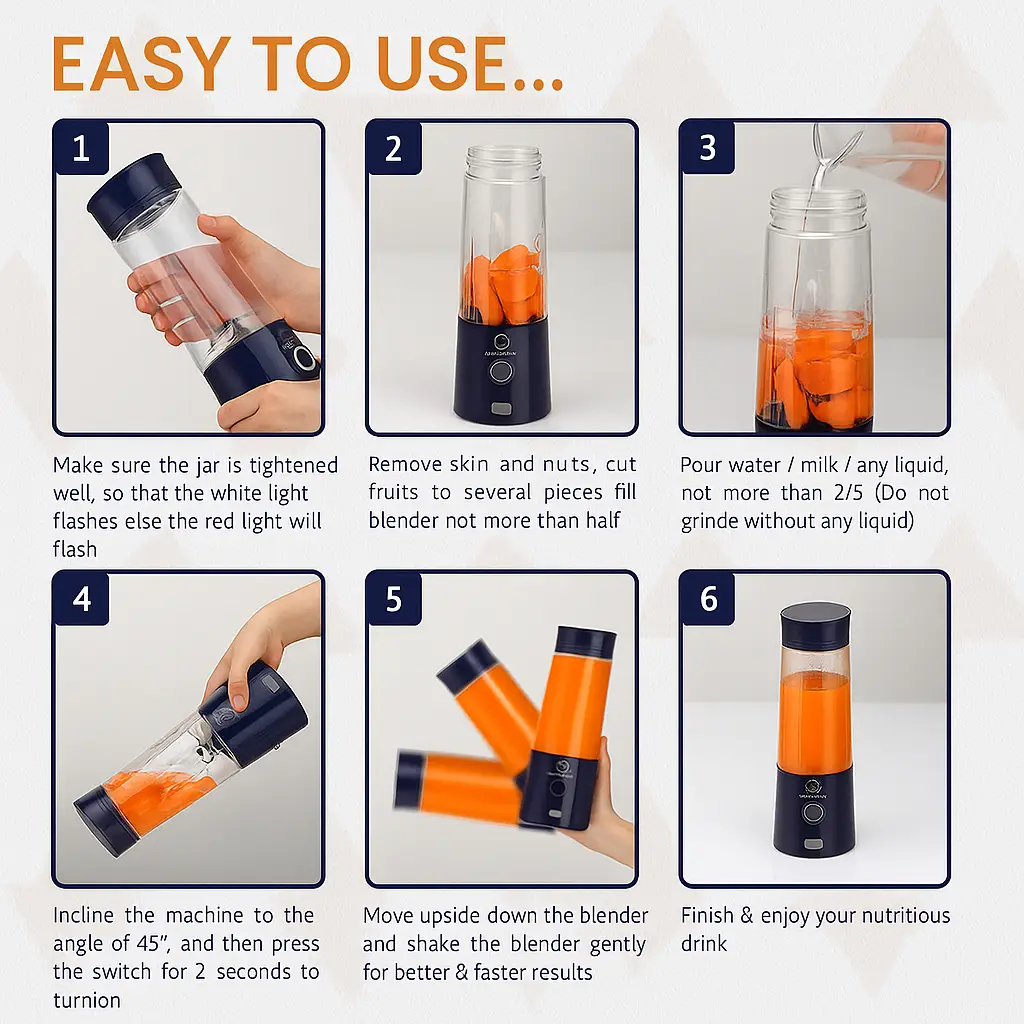 • POWER PACKED PERFORMANCE: The 6 sharp SS blades with rotation speed of 16500 rpm & battery capacity 3000mAh can power 7.4V powerful copper motor in order to whip up the desired juice and smoothies within 30 seconds.