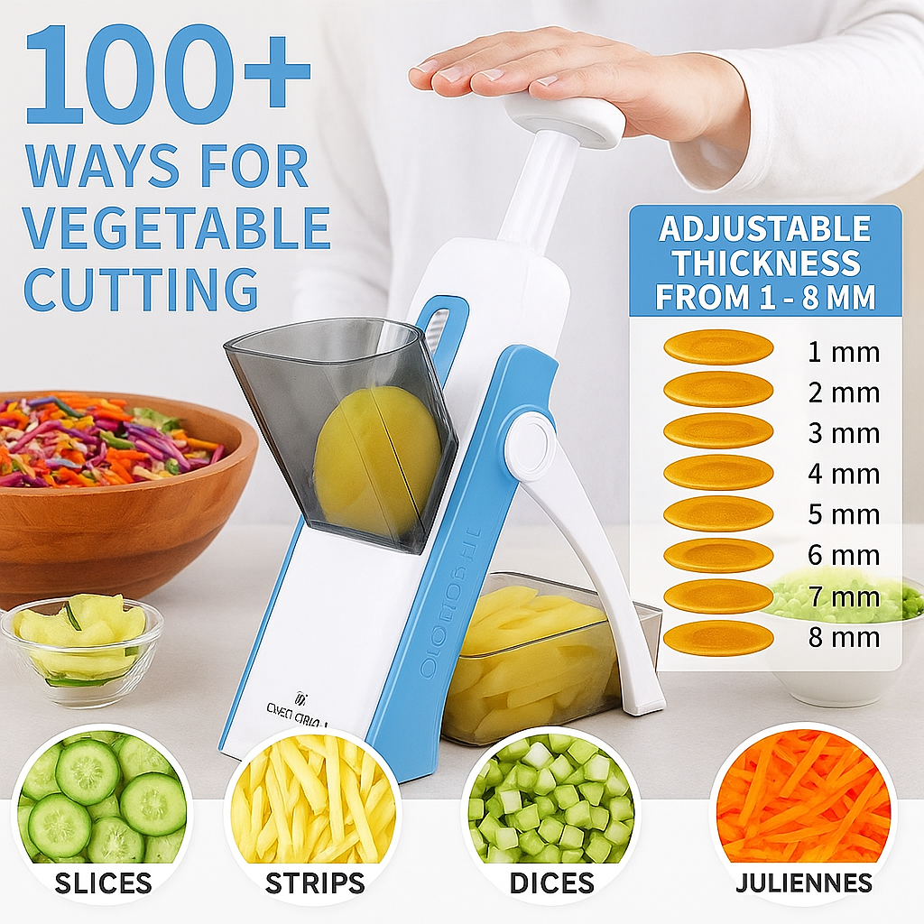 - VERSATILE: ONCE FOR ALL’s vegetable slicer offers 4 mode choices julienne, matchstick, slicing, and dicing at once no need to change the blade. Adjustable thickness 0.1-8mm great for quickly slicing potatoes, carrots, cucumbers, onions…